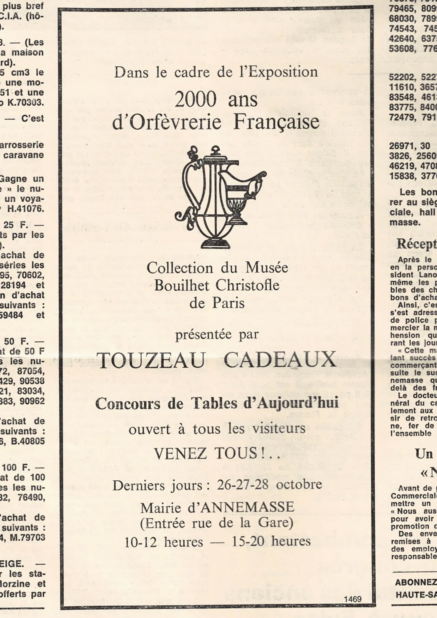 The event was hailed for its contribution to the enhancement of France's artistic heritage, and for making available to the local public pieces of goldsmithery of rare beauty. Numerous VIPs, including Mr Galloni d'Istria, sub-prefect of Saint-Julien, and Mr Tony Bouilhet, director of Christofle, honoured the opening of this landmark exhibition with their presence.