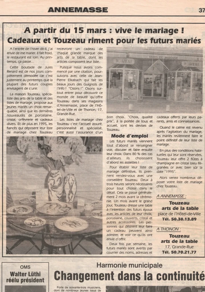 Published in March 1995 in the newspaper Le Messager, this article pays tribute to the Maison Touzeau d'Annemasse, renowned at the time for its expertise in wedding lists and tableware. Through a refined selection of porcelain, crystal, cutlery and gifts, Touzeau helped young couples prepare for their new life together.