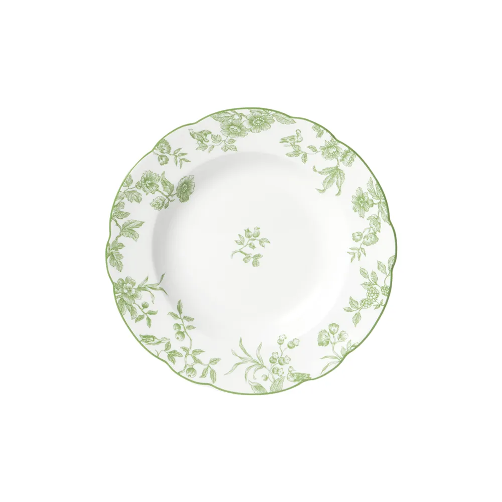 This porcelain compotier from the Albertine collection gracefully holds your fruit, desserts or sweets. Its delicate plant decoration, inspired by Jouy canvases, depicts a gentle, poetic nature. The scalloped shape underlines its refinement, while the soft green colour invites contemplation. A charming centrepiece for a romantic setting.