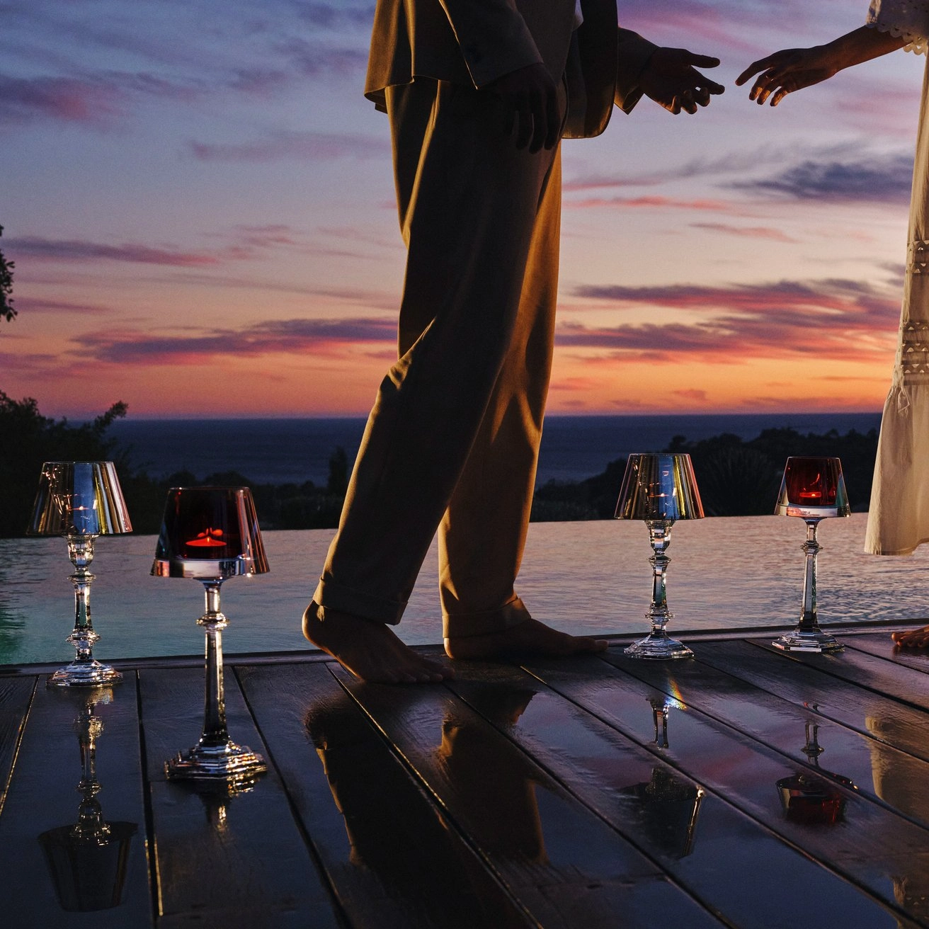 Created by Philippe Starck, the Harcourt Our Fire candelabra sublimates the brilliance of crystal into a fascinating play of light. Composed of three elements inspired by the legendary Harcourt glass, this candelabra is topped with a metallic shade - gold or silver - that filters the flame into a warm, vibrant light. A veritable sculpture of light, it adds a stylish, precious and spectacular touch to any interior.
