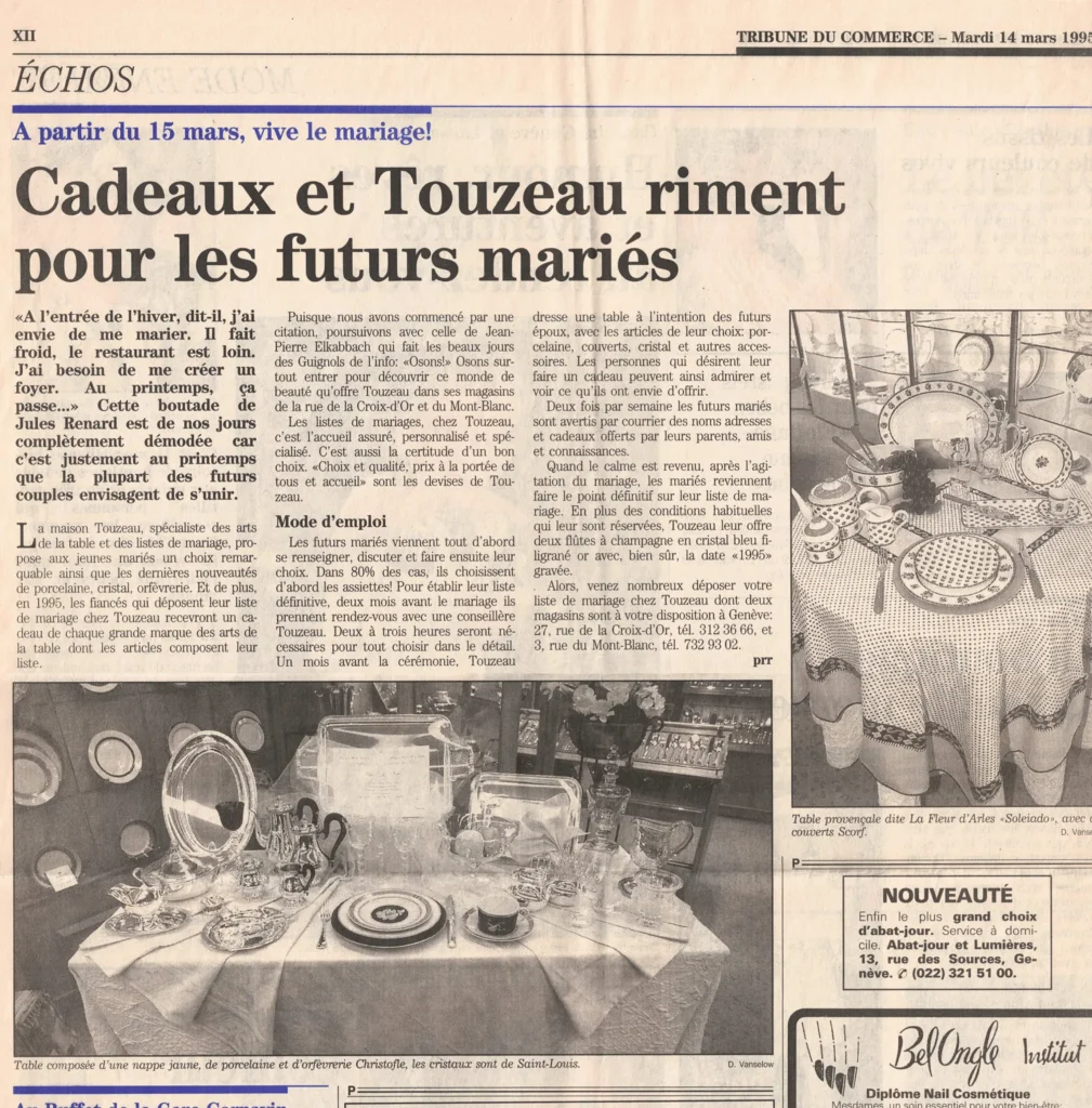 Publié en mars 1995 dans La Tribune de Genève, cet article met à l’honneur la Maison Touzeau, spécialiste des arts de la table et des listes de mariage personnalisées. Depuis plusieurs décennies, cette adresse emblématique de Genève guide les futurs mariés dans le choix de leur vaisselle, verrerie et orfèvrerie, en associant élégance et convivialité.